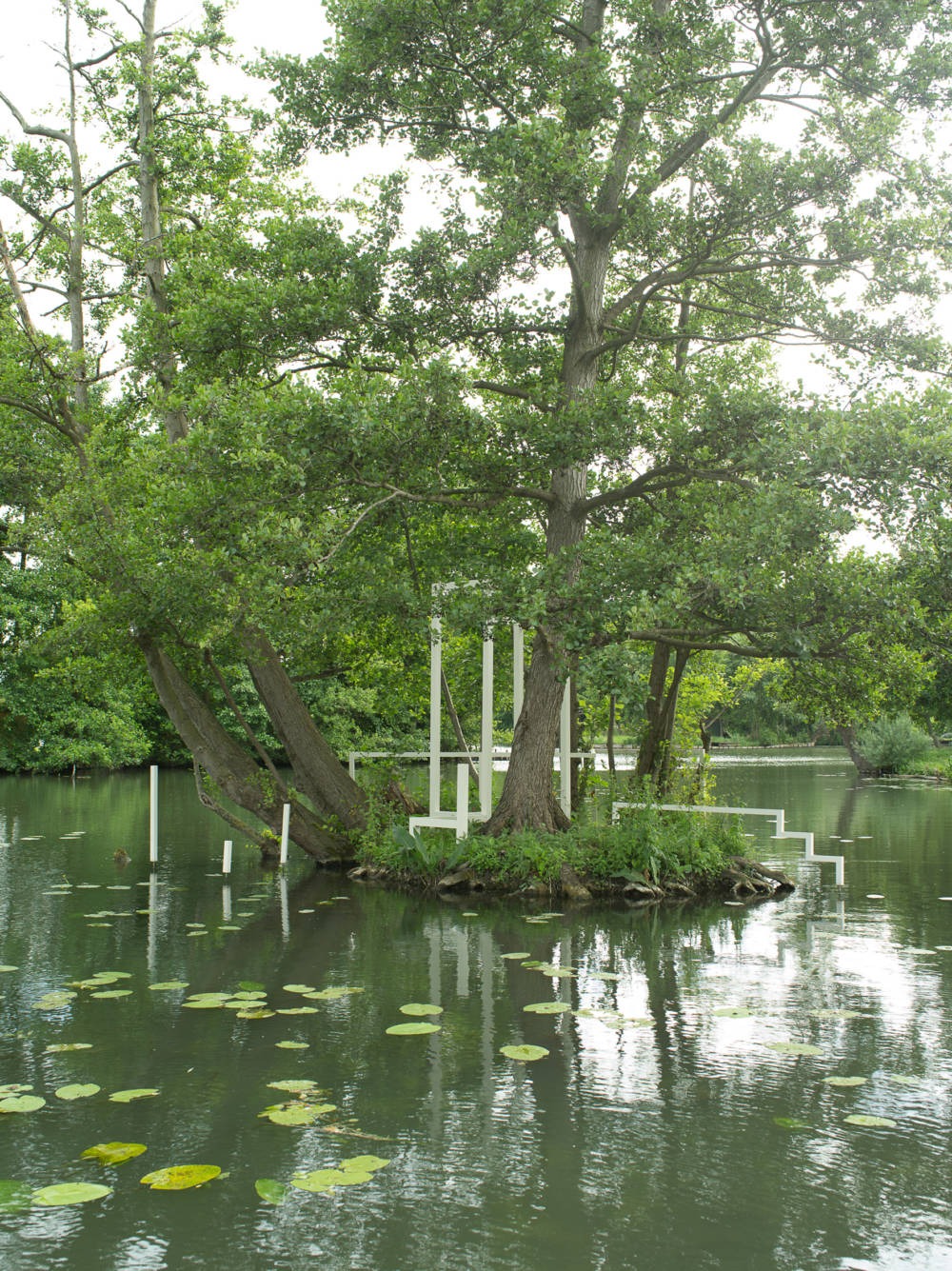 Elegant and ethereal, the sculpture by the visual artist Phoebe Eustance extends its immaculate lines along the banks of an islet in the Hortillonnages. The British artist, an ardent admirer of the work of Giotto di Bondone, the Italian architect and painter from Trecento who influenced generations of builders and inspired the Renaissance movement, adopts one of the motifs from his paintings and sets it amongst nature: characterised by its long, slim colonnades, its white galvanised steel structure, positioned between land and water, seems to launch an ascent skywards. It has been especially designed for the site and responds to its topography and vegetation, a graphic construction which is both in harmony and disharmony with the very particular ambience of the Hortillonnages. This creates a dialogue between the work and the space: lines and views are revealed, reflections appear, the water channels reflecting a troubled and distorted vision of the rectilinear structure to the visitor in a boat. A fleeting mirage or a real edifice, all interpretations are permissible for a piece which changes the visitor’s perspective of their environment.